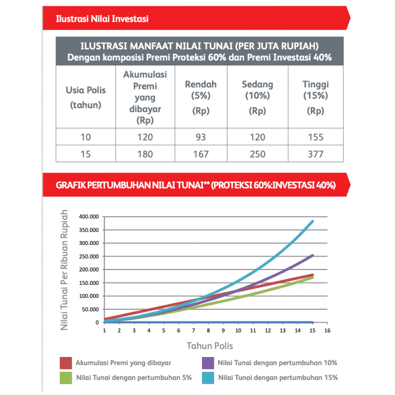 ** Kinerja dari investasi tidak dijamin. Nilai investasi dapat lebih besar ataupun lebih kecil dari Premi yang diinvestasikan, tergantung dari risiko masing-masing jenis Dana investasi. Pemegang Polis mengambil keputusan sepenuhnya untuk menempatkan alokasi dana investasi yang memungkinkan optimalisasi tingkat pengembalian investasi, sesuai dengan kebutuhan dan dana investasi yang dipilih Pemegang Polis. Hasil investasi Pemegang Polis tidak dijamin oleh Perusahaan Asuransi. Semua risiko, kerugian, dan manfaat yang dihasilkan dari investasi dalam program asuransi Unit link ini akan sepenuhnya menjadi tanggung jawab Pemegang Polis