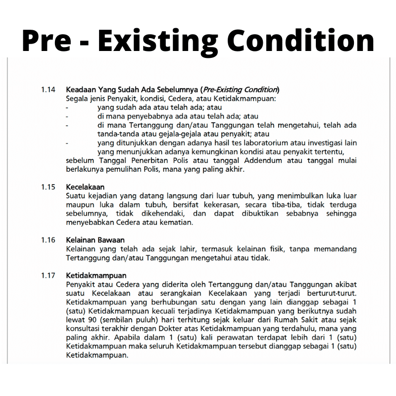 Pre – Existing condition adalah Keadaan yang sudah ada sebelumnya. Ini penting karena asuransi menerapkan kondisi ini.
