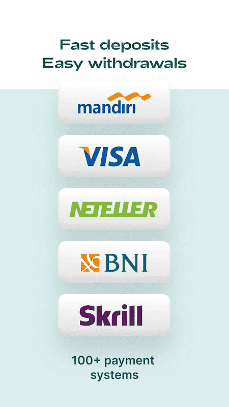 Tersedia pilihan transfer dan withdraw Rupiah melalui berbagai akun di bank di Indonesia, yaitu Doku, BCA, OVO, BRI, Mandiri, BNI dan Virtual Account.
