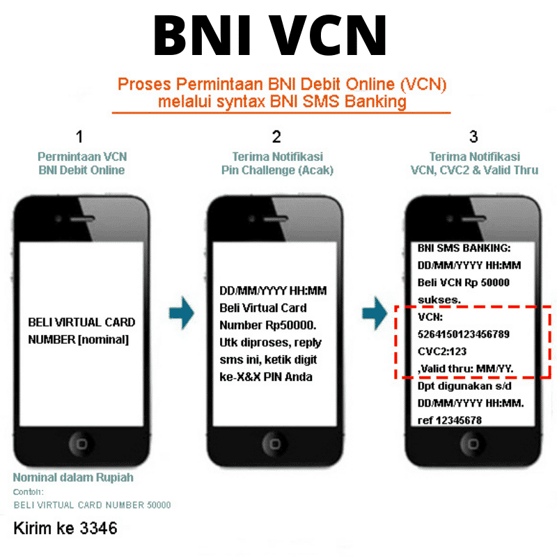 Prosesnya dimulai dengan Registrasi & Aktivasi BNI SMS Banking di kantor Cabang BNI terdekat. Kemudian meminta VCN melalui BNI SMS Banking.
