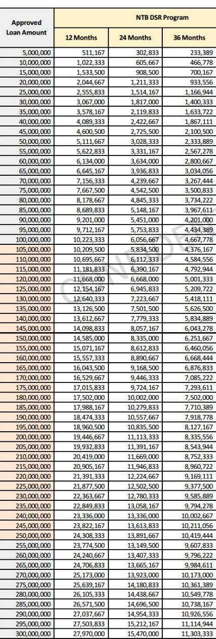 Saya mendapatkan simulasi KTA DBS untuk setiap plafon pinjaman dan cicilan per bulan di setiap tenor, sebagai berikut: