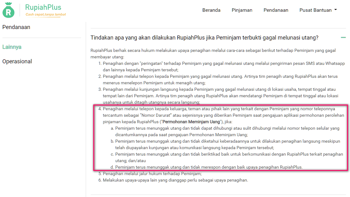 - Peminjam terus menunggak utang dan tidak beritikad baik untuk berkomunikasi dengan RupiahPlus terkait penagihan utang; dan/atau