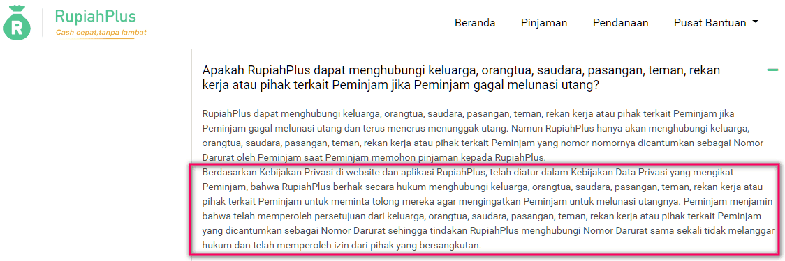 (1) Penggunaan data kontak untuk kepentingan pinjaman online sudah disetujui nasabah saat mengajukan kredit online. Tepatnya saat nasabah mengunduh aplikasi pinjaman. Logikanya, jika nasabah tidak setuju dengan ketentuan ini, sebaiknya jangan mengunduh atau mengajukan pinjaman. Dalam penjelasan di website, perusahaan pinjaman online menjelaskan kenapa mereka berhak menghubungi nomer kontak peminjam untuk keperluan penagihan (lihat print-screen terlampir).