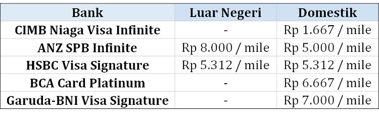 Anda dapat melihat website untuk memeriksa berbagai jenis kartu kredit yang tepat sesuai dengan kebutuhan anda. Sebagai contoh, berikut ini perbandingan beberapa produk kartu kredit dan poin Air Miles yang dapat diperoleh dari pembelian layanan penerbangan.