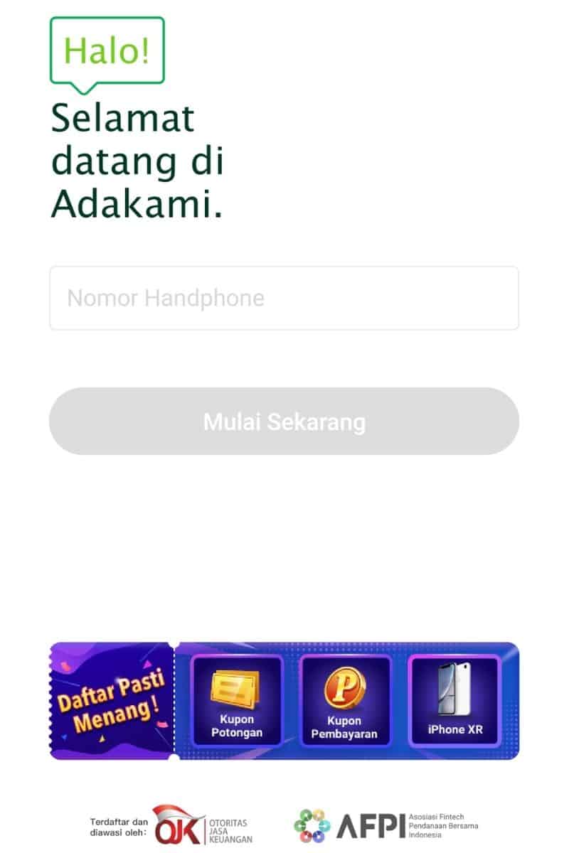 Setelah mengunduh aplikasi, Anda diminta mengisi no ponsel, yang digunakan untuk mengajukan pinjaman (ini wajib), lalu AdaKami akan mengirimkan kode verifikasi ke nomor tersebut yang Anda harus masukkan kodenya ke aplikasi.
