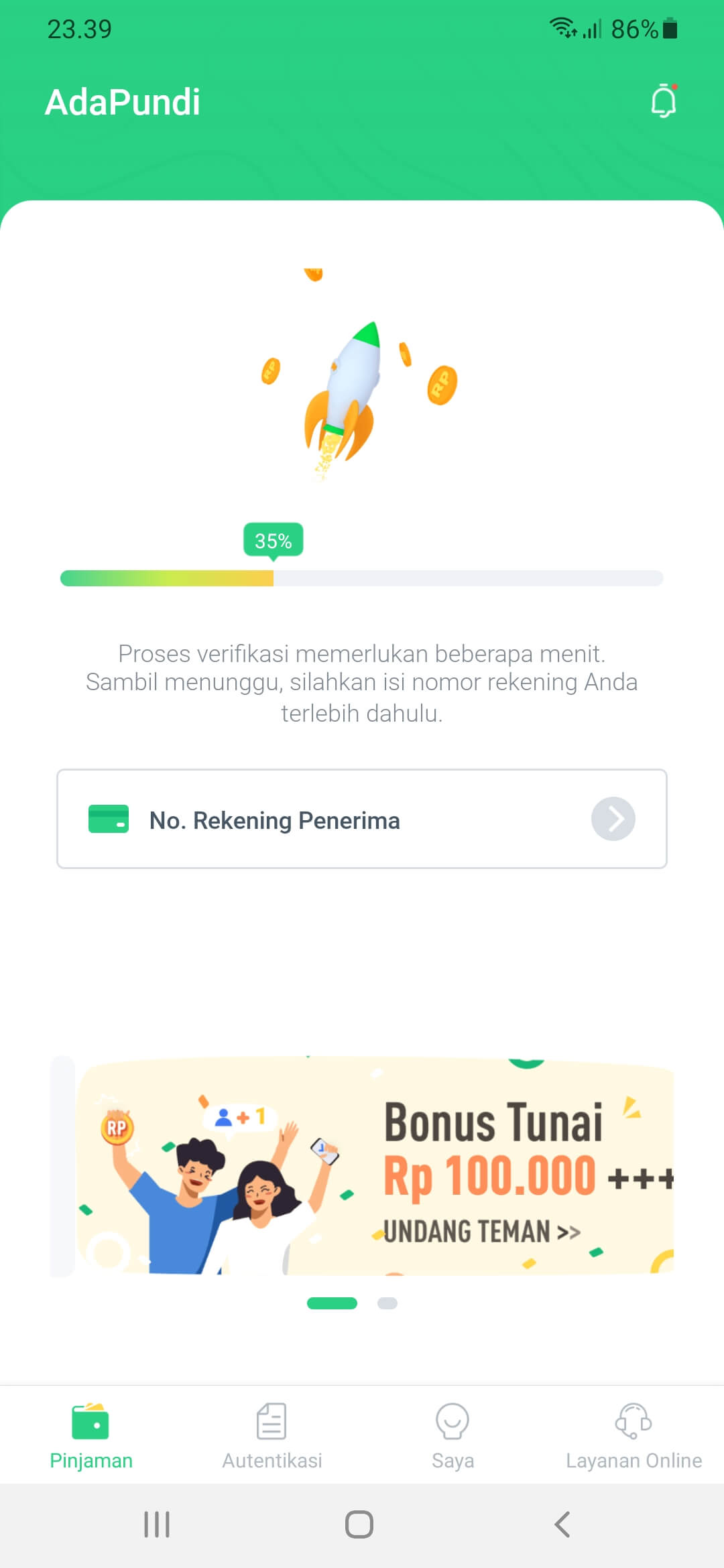 Buka aplikasi Adapundi, lakukan registrasi dan isi data diri sesuai petunjuk yang diberikan. Siapkan juga KTP dan nomor rekening bank atas nama peminjam.