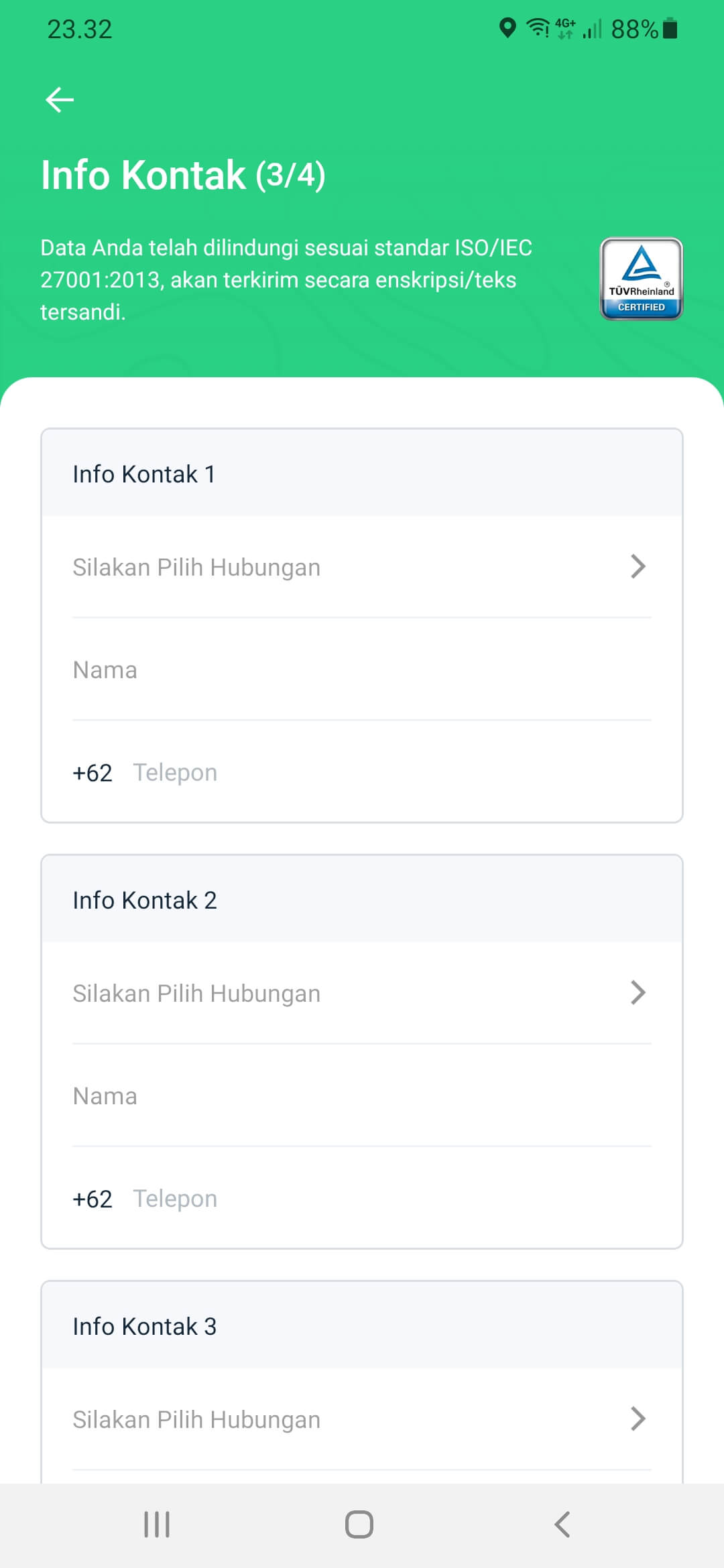 Isi dan lengkapi data kontak darurat, seperti no ponsel, nama dan hubungan dengan nasabah, sesuai dengan formulir dalam aplikasi. Diwajibkan menuliskan 3 kontak darurat.