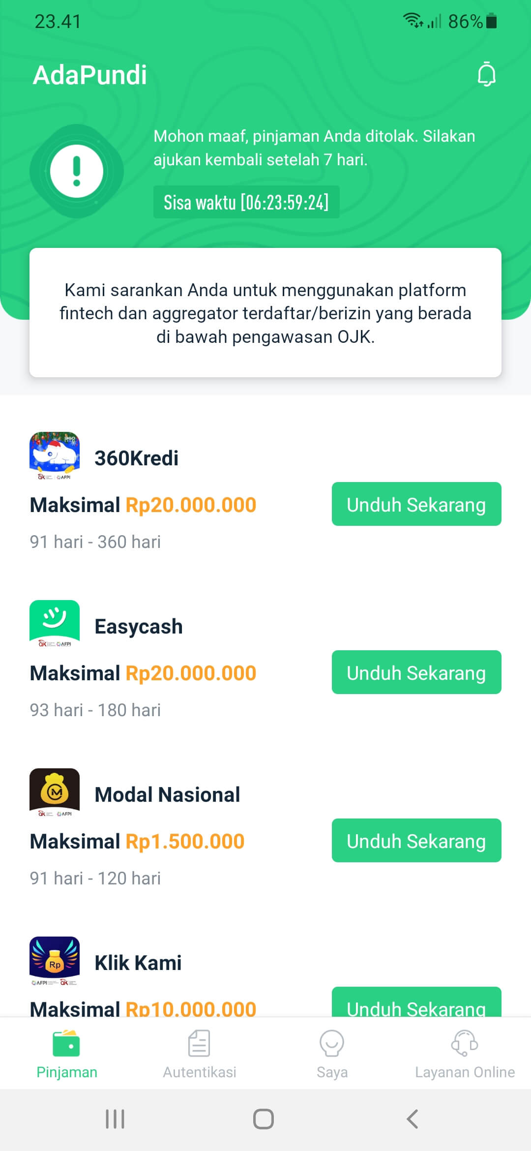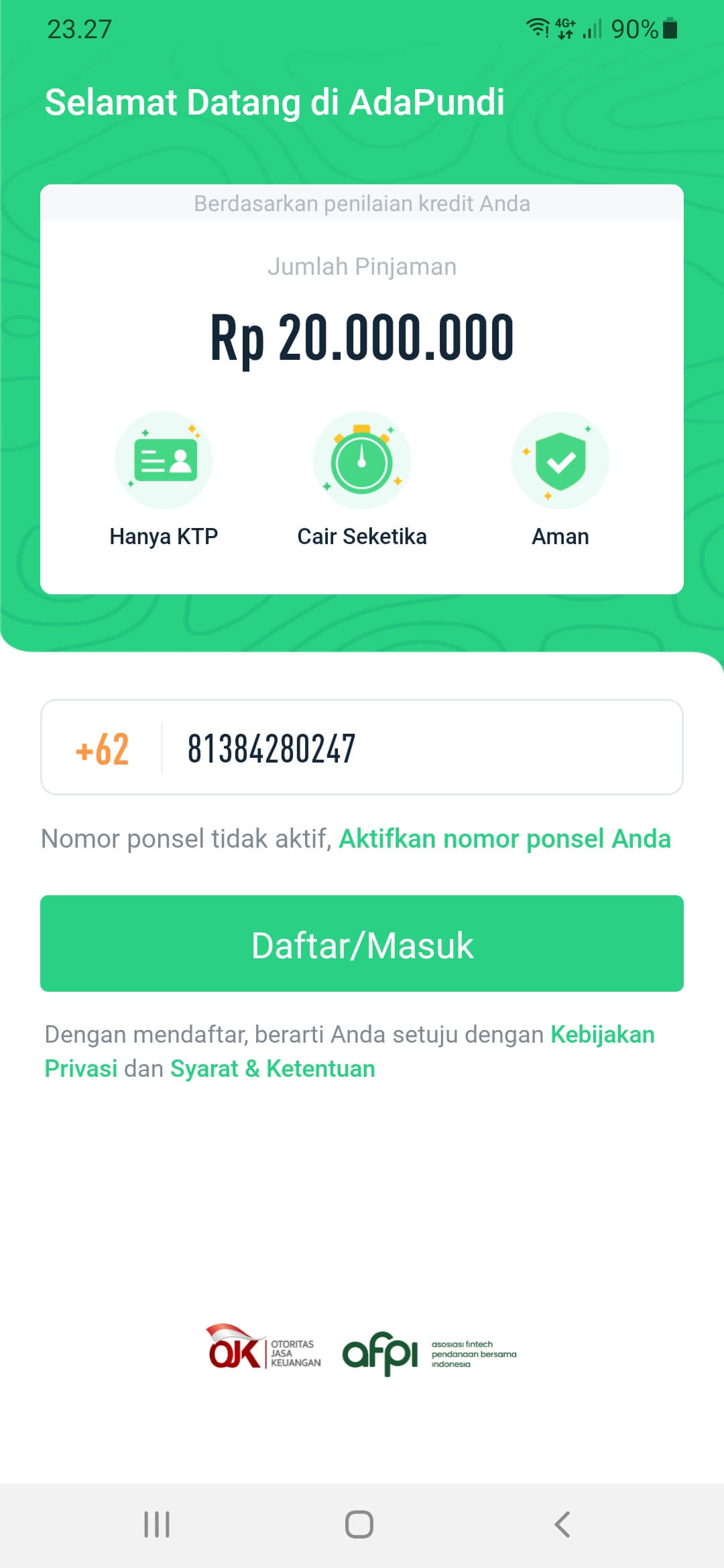 Salah satu aplikasi yang sudah berizin, terdaftar dan diawasi Otoritas Jasa Keuangan OJK yaitu Adapundi. Kami mengunduh aplikasi daan mengajukan pinjaman di Adapundi.