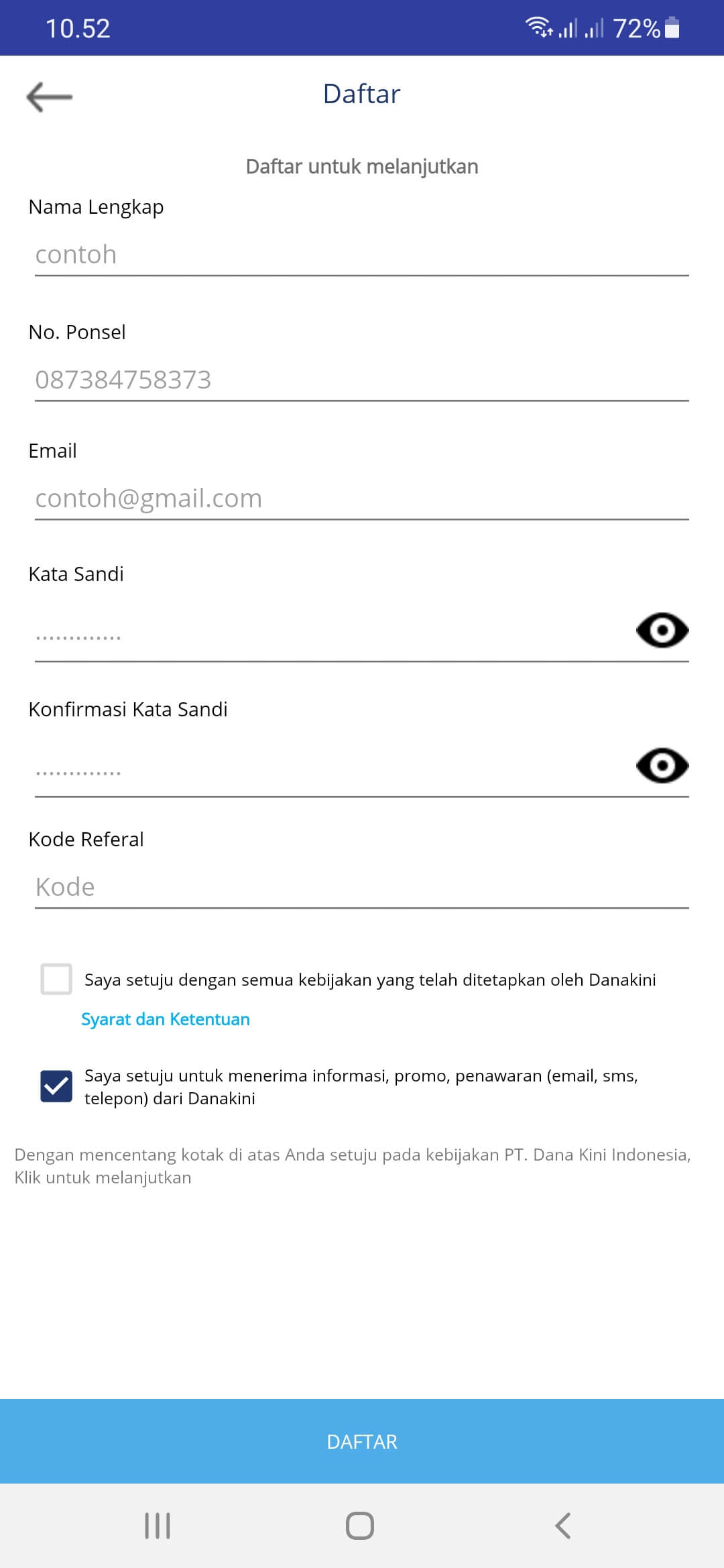Buka aplikasi Danakini, lakukan registrasi dan isi data diri sesuai petunjuk yang diberikan. Siapkan juga KTP dan nomor rekening bank atas nama peminjam.