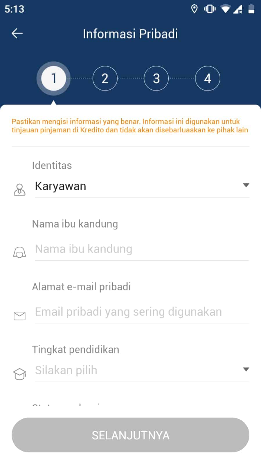 Isi dan lengkapi data pribadi sesuai dengan formulir dalam aplikasi.