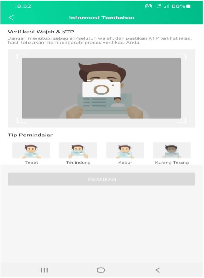 Pastikan bahwa hasil foto selfie jelas, tidak kabur dan sesuai panduan dari pihak Kredinesia. Hasil foto selfie penting karena akan dibaca oleh sistem AI Kredinesia untuk dianalisa.