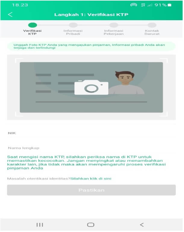 Ambil foto selfie sambil memegang KTP dengan kamera ponsel dimana aplikasi Kredinesia berada. Tidak diperbolehkan mengambil dengan kamera dari ponsel HP lain.