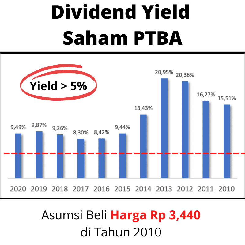 Saya cek catatan pembagian dividen PTBA sejak 2010 sampai akhir 2020 adalah berikut: