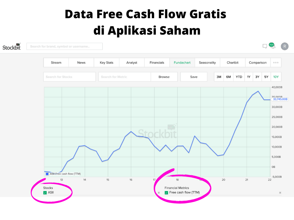 Data Free Cash Flow disediakan secara gratis di aplikasi sekuritas saham. Bahkan di beberapa aplikasi, data FCF diberikan sampai beberapa tahun ke belakang.