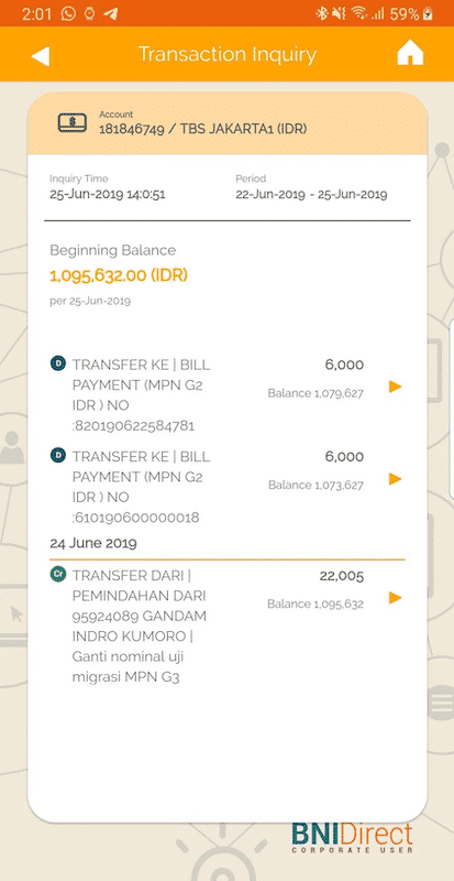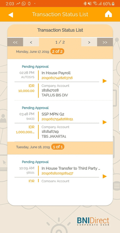 Aktivitas transaksi yang terjadi di BNIDirect (versi web) dapat juga dipantau melalui BNIDirect Mobile, begitu pula sebaliknya.