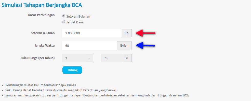 Berapa hasil menabung di tabungan pendidikan BCA secara rutin ? Di website disediakan simulasi yang bisa digunakan untuk menghitung hasil tabungan.